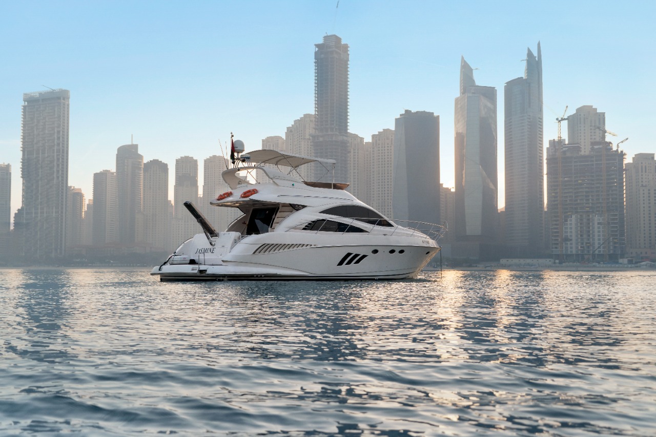 Luxury Yacht Rental Dubai features stylish exterior lines. Enjoy diverse water activities with high-class services on the Arabian Gulf Sea.